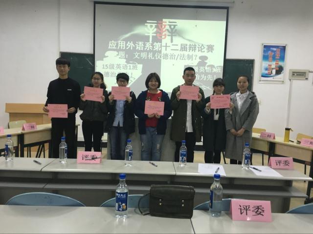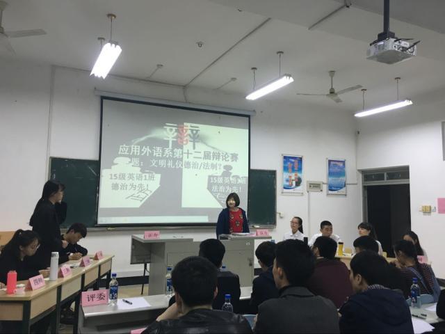 2016年3月30日,由应用外语系学生分会学习部承办的以“社会主义核心价值观”和“安全问题”为主题的第十二届辩论赛决赛在实验楼211多媒体教室正式开展。经过多次竞争选拔,2015级商务英语一班与2015级商务英语三班进入了最后决赛。应用外语系还邀请了各系学生会主席前来观看本次比赛。