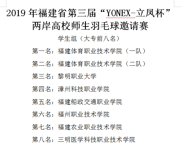 由福建省教育厅主办,福建体育职业技术学院承办的2019年福建省第三届“YONEX-立凤杯”两岸高校师生羽毛球邀请赛6月2日在福建体育职业技术学院胜利闭幕。比赛汇集37所省内及台湾高校,60支师生队伍,近600人参加激烈角逐。我校学生羽毛球队在比赛中发扬敢打敢拼、团结协作的精神,跻身大专组六强。这是在校领导注重学生全面素质发展的理念下,我校体育工作又添硕果。我们会以竞赛为平台,大力发展学生体育社团与体育第二课堂活动,推动学校学生阳光体育运动开展。