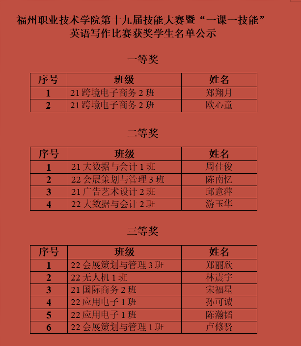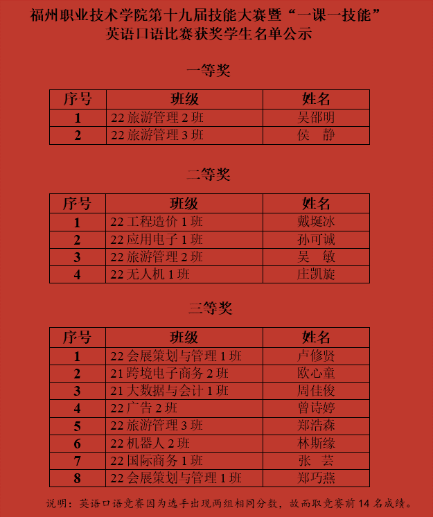 为进一步提高学生英语口语、英语写作能力,强化学生职场的商务沟通能力,同时为福建省技能竞赛选拔优秀选手,公共教育部于10月26日至11月1日期间采取线上线下相结合的方式,在疫情防控期间顺利举办了福州职业技术学院第十九届技能大赛暨“一课一技能”——英语口语、英语写作比赛。
