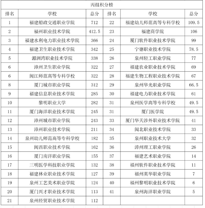 近日,福建省第十七届运动会大学生部总积分出炉。本届省运会由福建省人民政府主办,福建省体育局和南平市人民政府承办,是2022年我省举办的规格最高、规模最大的综合体育盛会,共设置青少年部、社会俱乐部、群众部、行业部、大学生部等5个部。其中,大学生部赛事设甲A组、甲B组、乙组、丙组四个组别,丙组共有41所高职院校参赛,我校摘得16金9银12铜,共获37枚奖牌的优异成绩,位居丙组积分榜前列,并荣获体育道德风尚奖。具体总积分如下: