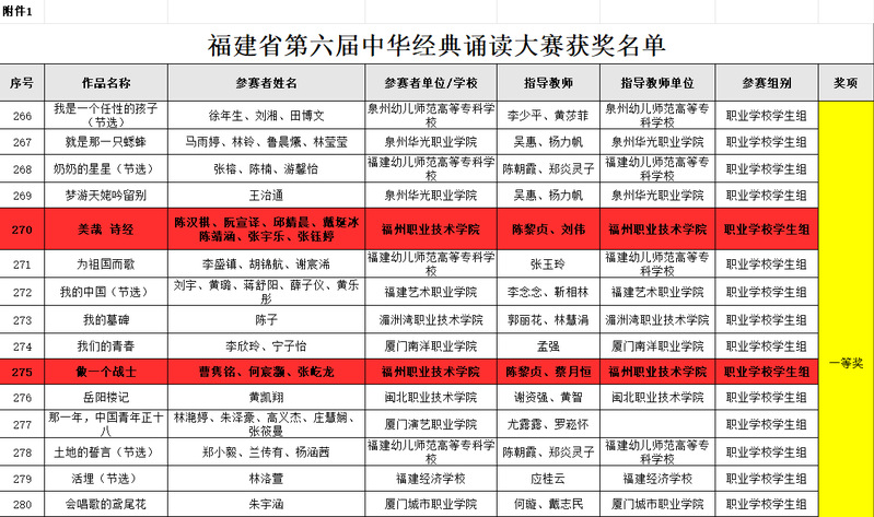 近日,福建省教育厅公布了福建省第六届中华经典诵读大赛获奖名单。我校通识教育学院推送的《美哉诗经》(指导老师:陈黎贞、刘伟)和《做一个战士》(指导老师:陈黎贞、蔡月恒)均荣获职业院校组一等奖,并已进入国赛总决赛。