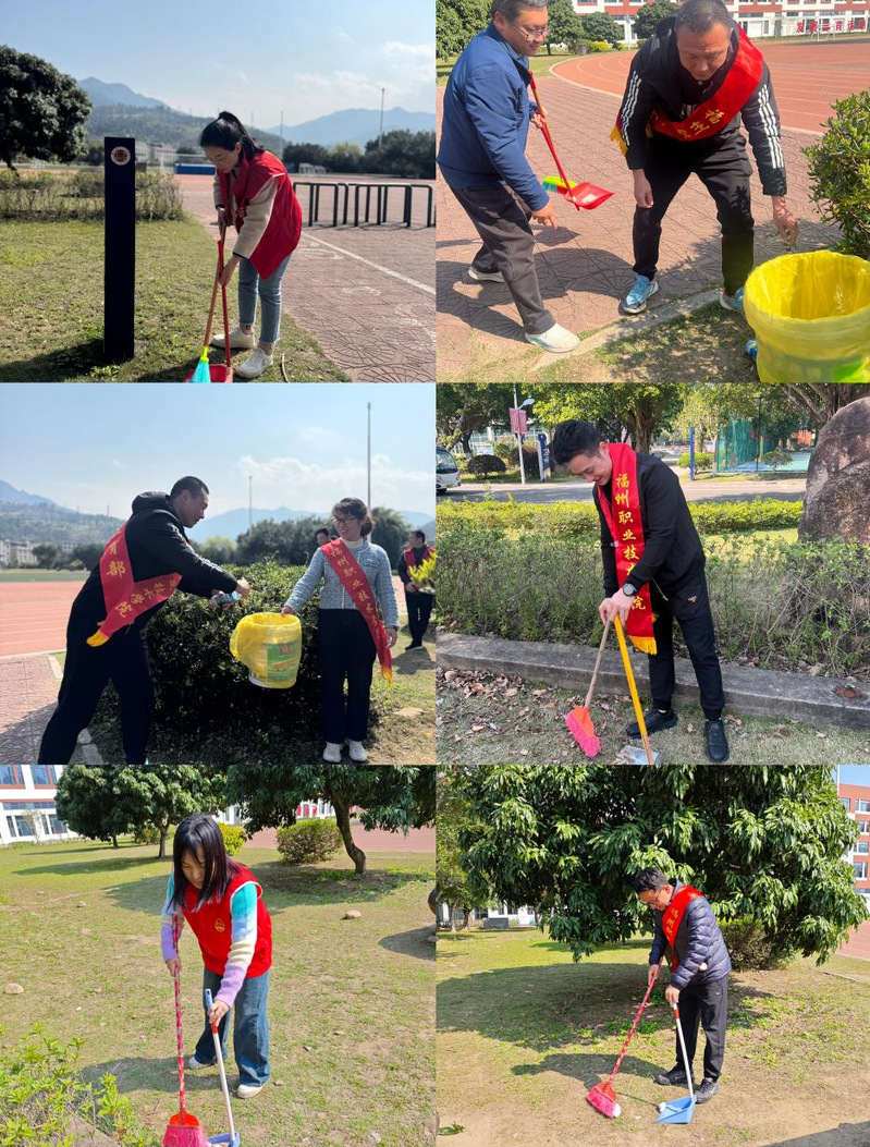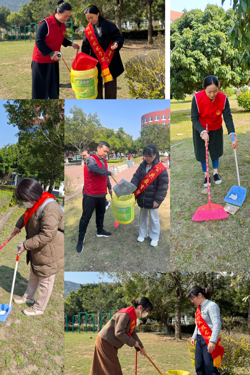 党员志愿者们手持扫帚、垃圾夹和环保袋,在校园的田径场和健身馆绿化带旁清扫垃圾,忙碌的身影成为校园里一道亮丽的风景线。