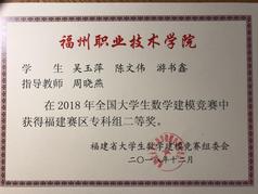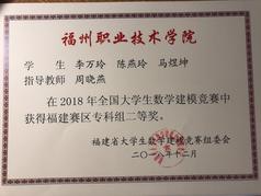 2018年全国大学生数学建模竞赛获得福建赛区专科组二等奖,指导老师:周晓燕。