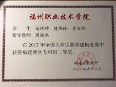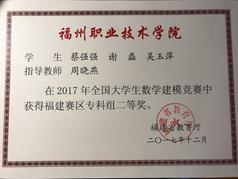 2017年全国大学生数学建模竞赛获得福建赛区专科组二等奖,指导老师:周晓燕。