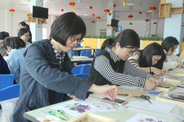 本次活动邀请福州花卉苗木行业协会花艺研究会蔡璐老师为女教职工们授课,她从什么是押花艺术、押花艺术的历史、押花艺术的特点、押花的制作过程等方面进行讲解。到场的女教职工们边聆听课程边动手操作,还相互交流创意,交换花材。一小时过去,大家都陆续完成了自己的押花艺术作品,现场气氛其乐融融,十分温馨。
