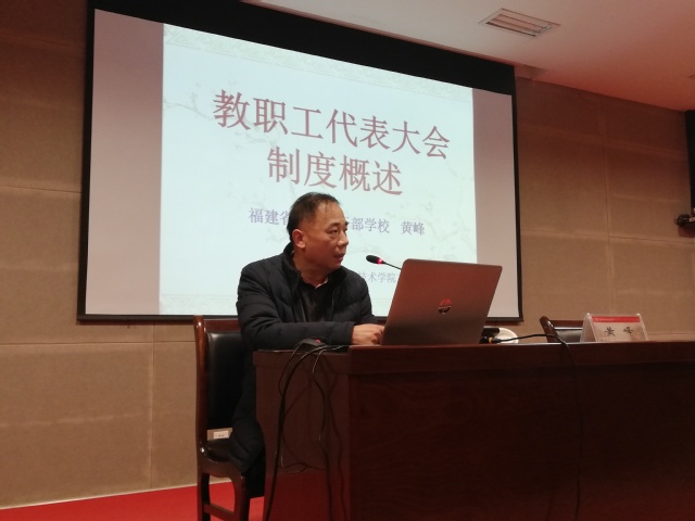 讲座邀请福建省总工会干部学校黄峰老师授课,黄老师从职工民主管理基础知识、教代会制度概要和“两会合一”规范运作等方面进行报告。讲座中,黄峰老师结合高校实际,对教代会职权、代表的权利与义务、提案的征集和处理做了重点介绍。