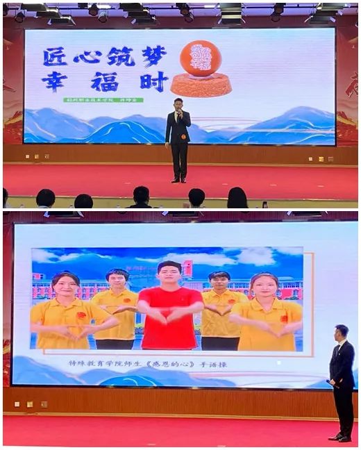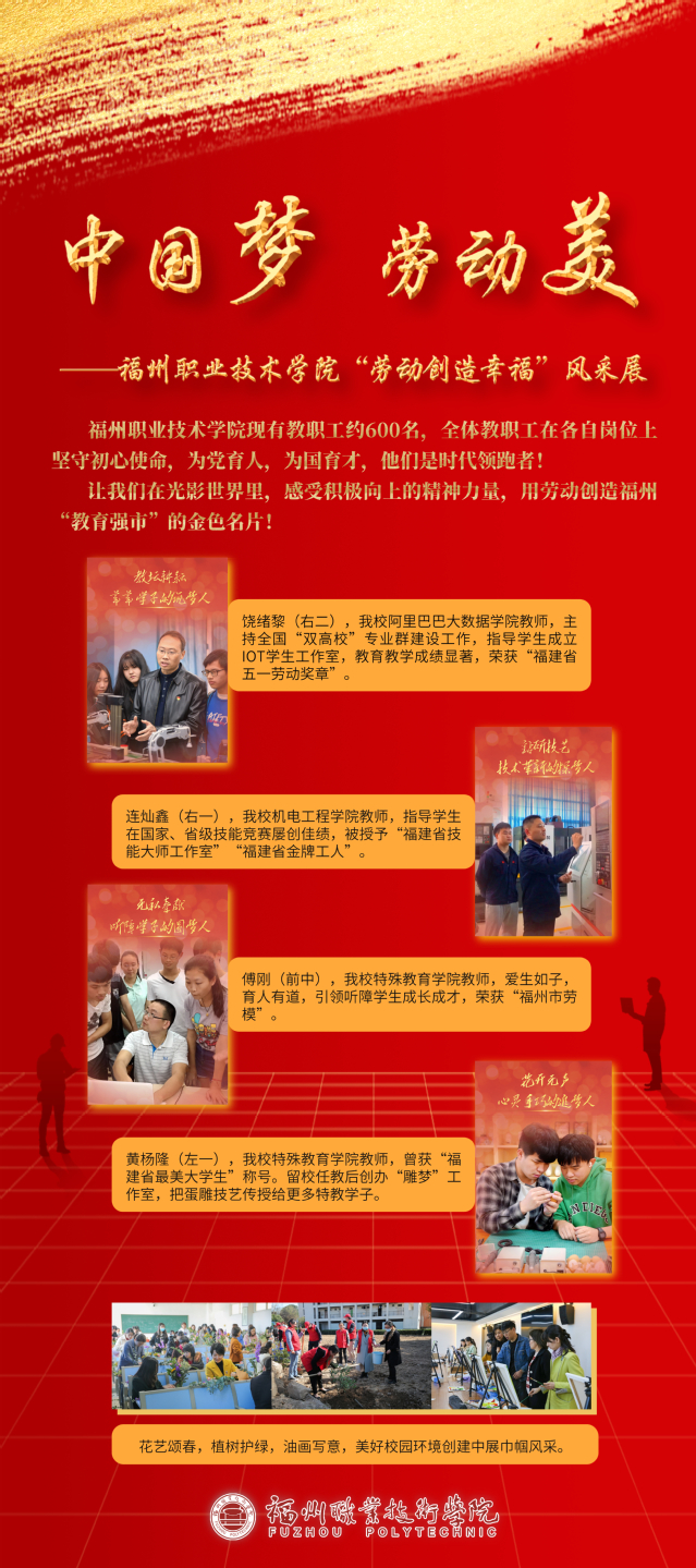我校通过《中国梦劳动美——福州职业技术学院“劳动创造幸福”风采展》主题展板和教师代表许坤金老师《匠心筑梦幸福时》主题演讲,生动讲述了饶绪黎、连灿鑫、傅刚等励园教师崇德修身、潜心教书育人的鲜活事例,充分展示福职人坚守“为党育人、为国育才”初心使命,坚持立德树人根本任务,努力培养堪当时代重任的“复兴栋梁、强国先锋”的育人风采。