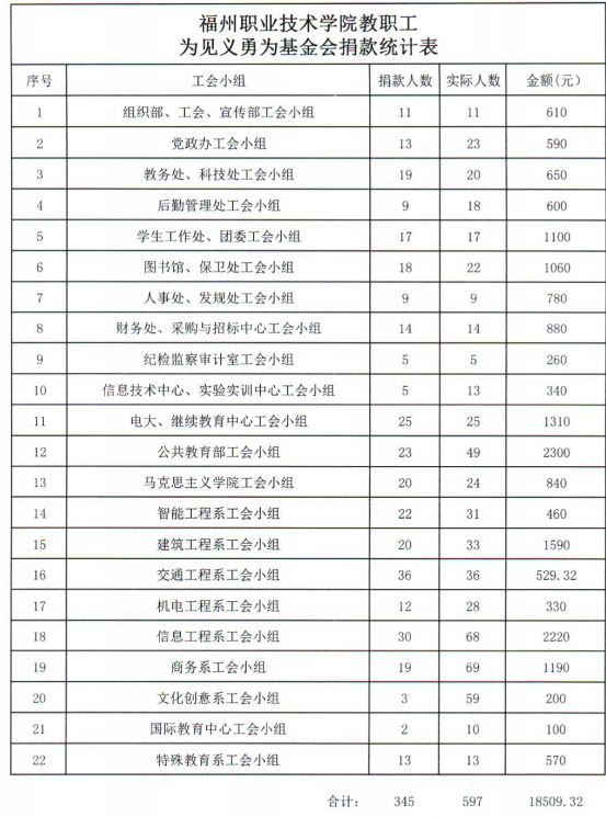 近日,我校积极响应《向福州市见义勇为勇士捐款献爱心的倡议书》(榕义委〔2022〕3号),组织教职工为见义勇为勇士捐款献爱心,在校领导的带头下,全校22个工会小组共有345位教职工积极响应,合计捐款金额18509.32元。其中,组织部工会宣传部、教务处科技处、学工处团委、人事处发规处、财务处采购与招标中心、纪检监察审计室、电大与继教中心、交通工程系等8个工会小组均全员参与捐款献爱心,公共教育部工会小组更是慷慨解囊,23位教职工合计捐款2300元。