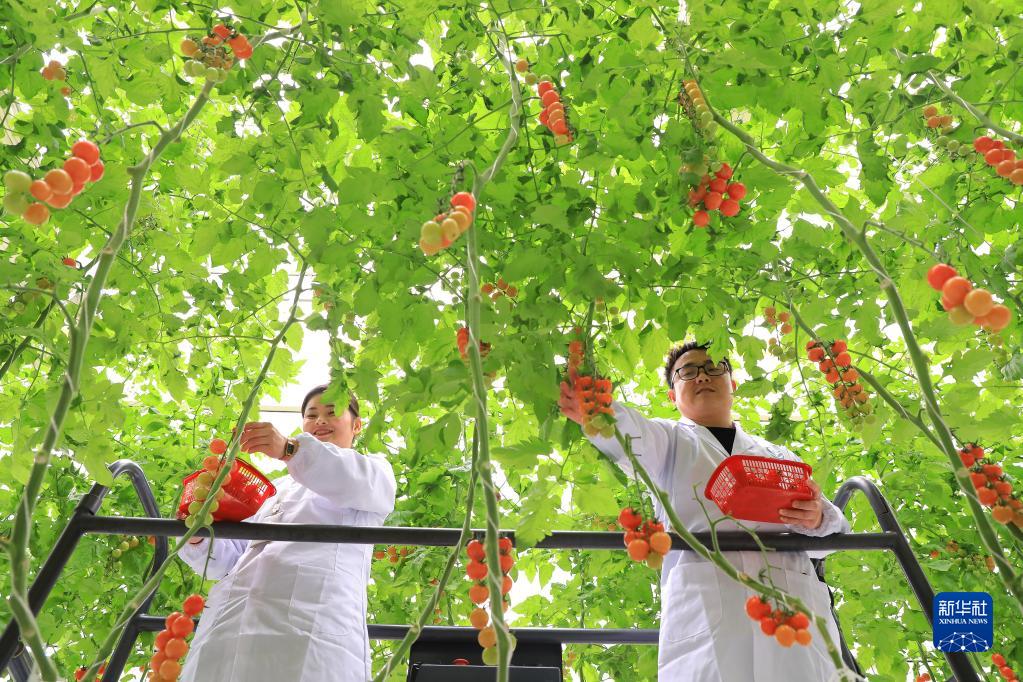 2022年2月18日,湖南省东安县华维节水公司智慧农业大棚内,员工们采摘圣女果准备上市。新华社发(严洁摄)