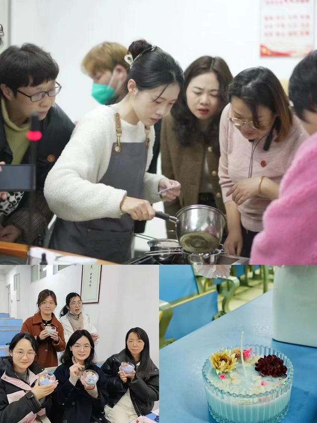 香薰蜡烛DIY现场,香薰老师向大家普及了香薰艺术文化,进行制作演示和讲解,女教职工们边看边学、互相协作,进行融蜡、冷却、装饰等步骤,将自己对美的领悟融入到制作之中,完成了一份份充满创意和浪漫气息的香薰蜡烛。