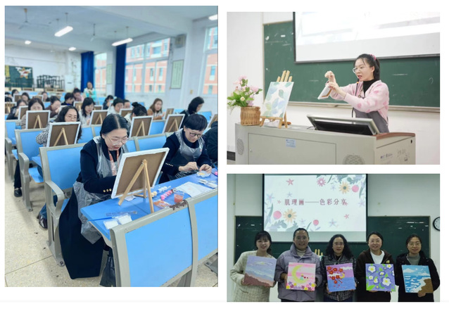 肌理画绘制现场,绘画老师讲解了肌理画的制作流程和创作技巧,女教职工们自由发挥、奇思妙想,混砂、调色、勾线、涂抹一气呵成,绘制出一幅幅精美的艺术品,在颜色与肌理的碰撞中体会绘画的生动和趣味。