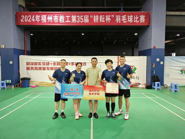 5月25日至26日,福州市教育工会主办的第35届“耕耘杯”羽毛球比赛在福州市工人文化宫举行,经过两天的激烈角逐,由我校羽毛球协会会长夏勇为领队,陈琳琳、王琳、刘薇、刘伟等队员组成的教工代表队在61支代表队中脱颖而出,喜获比赛二等奖,队员们顽强拼搏、奋勇争先,充分展示了“福职人”积极向上的精神风貌。