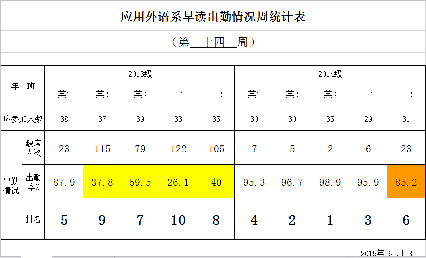 应用外语系早读出勤情况周统计表(第 十四 周)