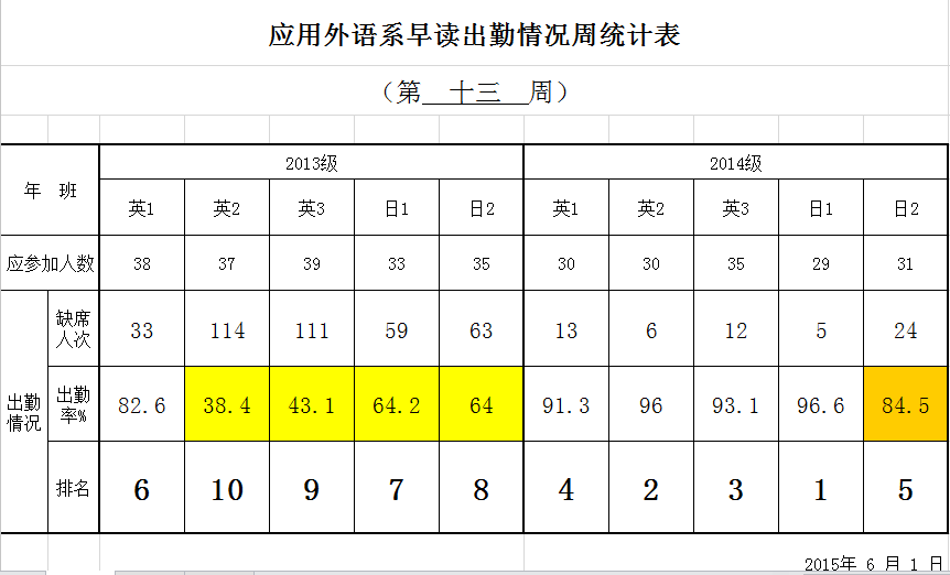 应用外语系早读出勤情况周统计表(第 十三 周)
