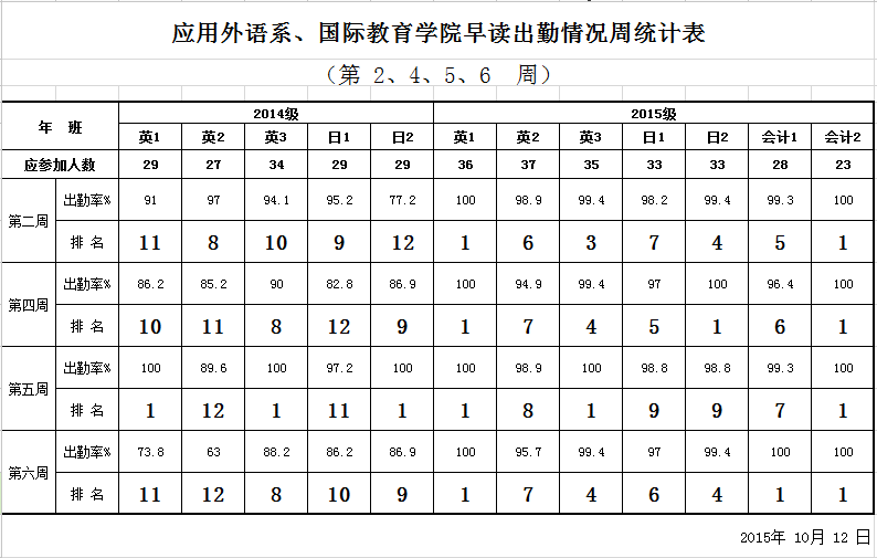 应用外语系、国际教育学院早读出勤情况周统计表(第 2、4、5、6 周)