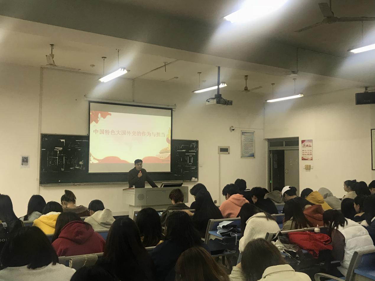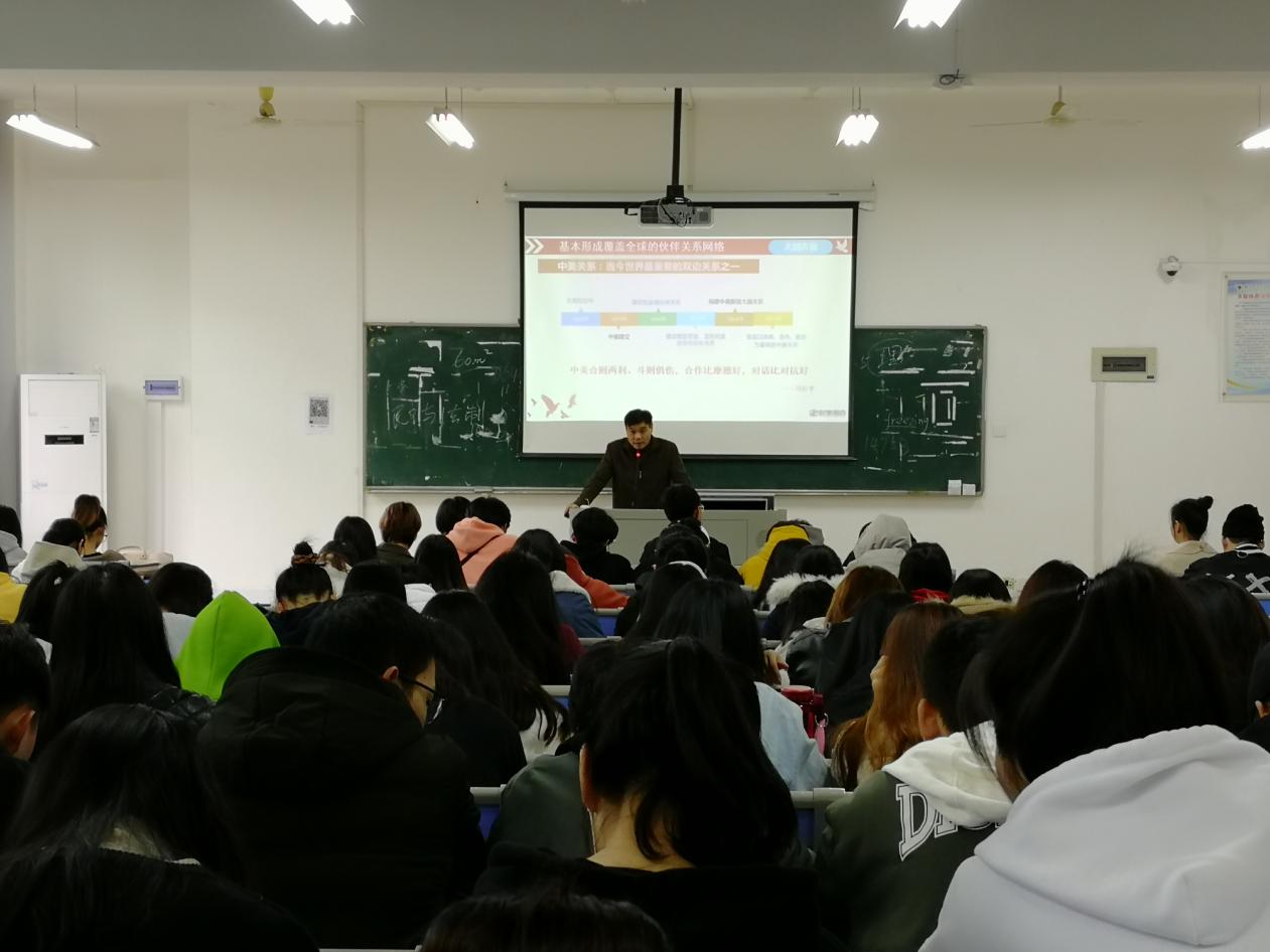 为教育引导学生正确认识世界和中国发展大势,促进学生对中美关系的了解,激发爱国热情,2019年12月19日,国际教育学院在实验楼310教室开展形势与政策课。本次课程由国际教育学院院长范高明担任主讲,全体17级学生参加。 课上,范高明院长介绍了当下国际政治格局,回顾了四十年间中美关系的发展历程,深入剖析了中美贸易战背后的实质。同时,范院长讲述了中国特色大国外交的作为与担当,指出在中美关系变化上,只有坚持平等互利,合作共赢的原则,才能助推中美关系重回正轨。 本次形势与政策课,帮助学生多角度认识了中美关系的历史演变和发展,丰富了学生的知识储备,开拓了视野,对提高学生的思想政治素质,具有重要意义。