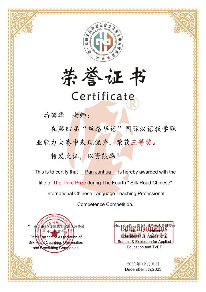 教学能力大赛中喜获佳绩 近日,第四届“丝路华语”国际汉语教学职业能力大赛在黄河水利职业技术学院圆满落下帷幕。经过初赛、决赛的激烈角逐,我校国际教育中心潘珺华老师荣获三等奖。 此次大赛由“一带一路“国家院校和企业交流协会中方理事会联合世界22所大学、高职院校和教育机构共同举办。参加初赛的教师来自全国18个省级行政区,以及英国、俄罗斯、印度尼西亚等5个国家。经过严格的作品初审、专家评审及成绩复核等工作程序,最终评选出33名选手入围决赛。在决赛中,我校潘珺华老师以精心的教学内容设计、稳定的讲课发挥赢得评委的肯定,展示出了我校国际中文教师出色的教学水平。 参加此次大赛推进了我校师资队伍国际化能力建设,为推动学校国际教育事业高质量发展提供有力的人才支撑。