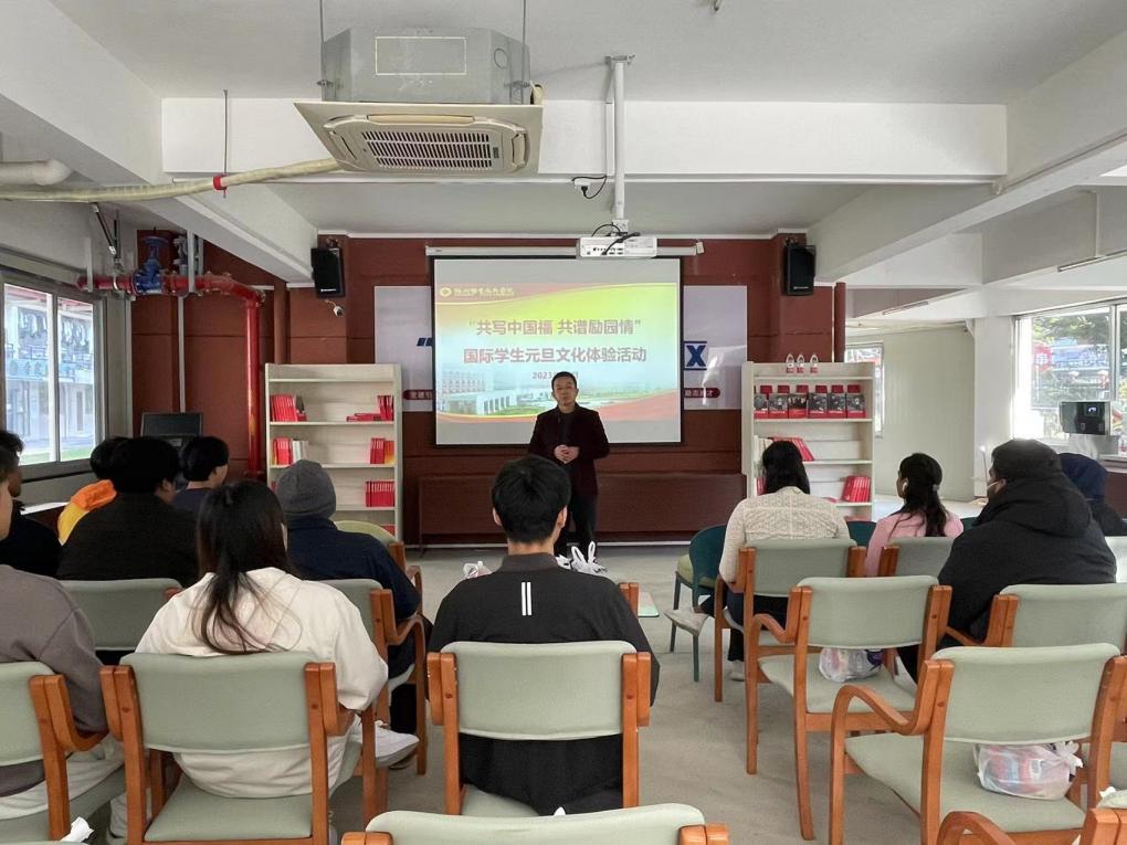 国际教育中心开展“共写中国福 共谱励园情” 元旦节主题活动 为增进国际学生对中华文化的感知与理解,进一步弘扬中华优秀传统文化,提升我校师生书法审美水平,落实以文化人育人使命,国际教育中心于2023年12月29日,开展主题“共写中国福 共谱励园情”——喜迎元旦写“福”字主题活动,国际教育中心主任彭胜敏、副主任严钦、辅导员、全体国际学生参加本次活动。 现场,彭胜敏主任向国际学生介绍了中国“写福、送福、祈福”的传统习俗,并手拿毛笔蘸墨,指导学生书法中锋运笔的运用,“用笔尖沾墨、按照笔画前进方向,再反方向落笔、平直运笔,最后收笔,‘福’字就写好了”。严钦副主任向全体留学生送上新春问候并希望利用三天假期时间多了解中国文化,学习专业知识,更好更快融入福职院大家庭,成为中外文化交流桥梁和传递使者。