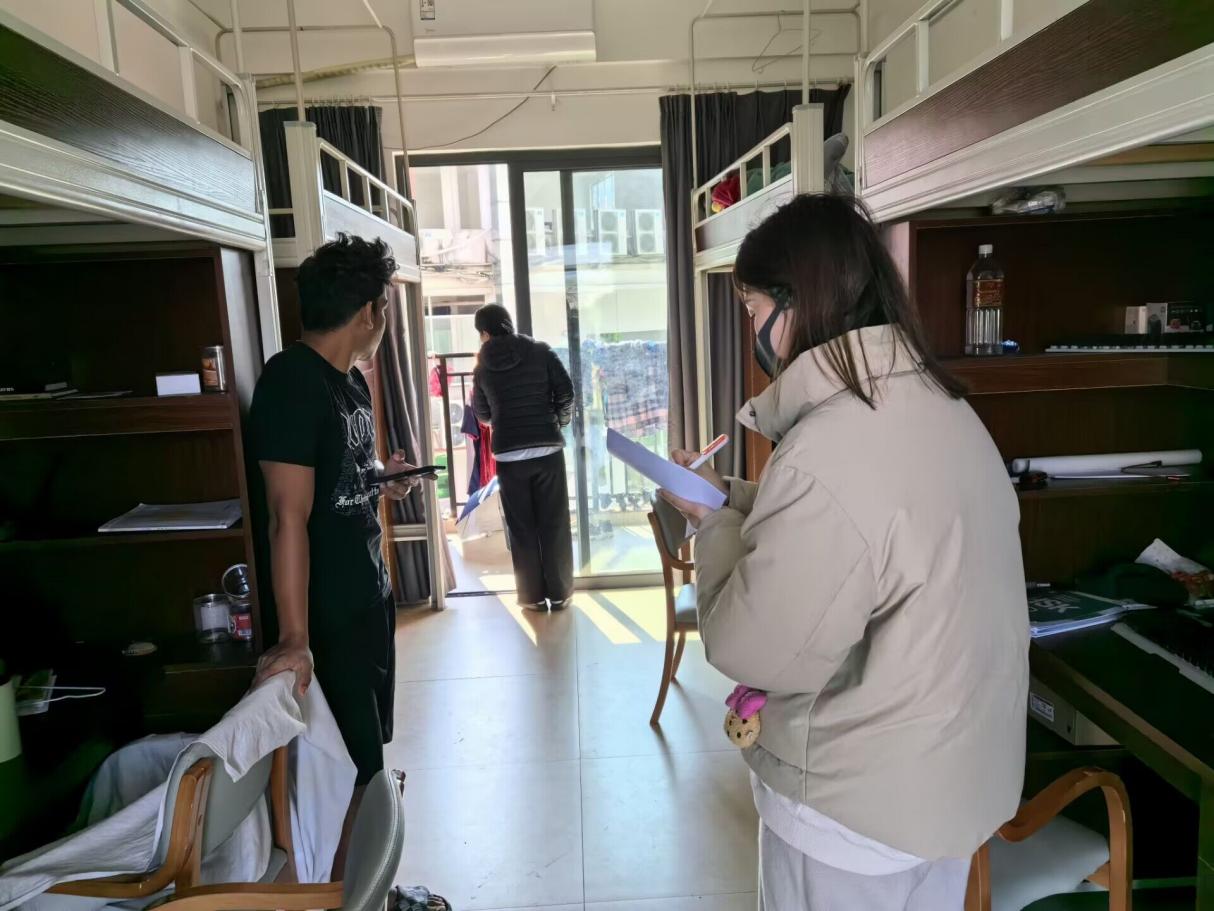 为杜绝宿舍安全隐患,提高国际学生安全意识,筑牢宿舍安全防线,自2023年1月18日起,国际教育中心组织辅导员、值班教师、宿舍宿管等每天定期走访国际学生宿舍,开展宿舍安全排查。