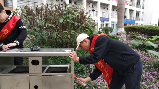 活动前期积极开展宣传工作,通过海报、展板、网络在校内进行宣传,重点宣传活动的目的、流程和意义,使志愿者们普遍了解此次活动,提高本次活动的参与度。活动分为5项,分别为:校园内主干道、人行道、绿化带等垃圾清捡活动;“校园牛皮癣日日清”清除校园小广告活动;“重塑课桌文明”清扫课桌活动; “文明标识引你看”校园标识、雕塑清扫活动;“握在手心里的温暖”楼梯扶手清洁活动。根据事先安排,每项活动由专人负责,集中活动时间为中午、傍晚及周末。