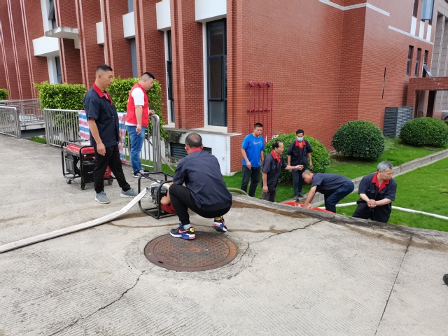 防汛演练模拟健身馆附近出现积水,准备对特教大楼地下车库口封堵;健身馆附近严重积水,防洪堤出现缺口,发现险情。