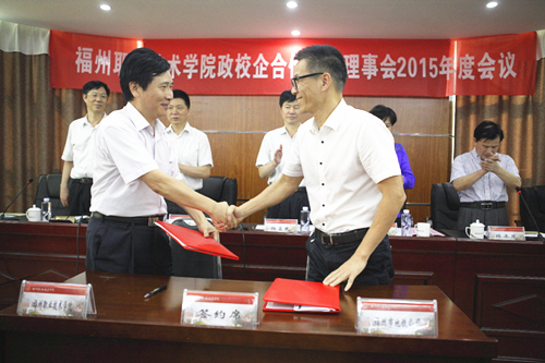 - 2015年9月18日下午,福州城市地铁有限责任公司总经理潘红卫与福州职业技术学院副院长刘松林签订了合作办学协议,正式确立福州城市地铁有限责任公司2015级三年制订单班在福州职业技术学院进行委托培养。福州市人民政府杨益民市长、陈晔副市长以及政府相关部门和行业企业领导共同见证了签字仪式。