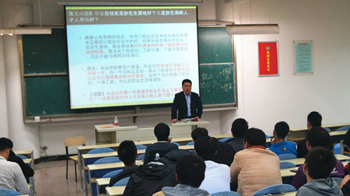 讲座上 ,来自中国海峡人才市场的丁龙印老师首先通过PPT就同学们心中的一些问题逐个解答,然后向我们介绍了,丁老师通过举例“新录用公务员工龄计算问题”反复强调就业协议书、报到证和档案对职业生涯发展的重要性,及对人事代理的作用可谓至关重要。除此之外,丁老师还介绍了工龄计算,还例举了“档案没更新,事业单位录用受阻”的一篇新闻报道,更进一步证实了人事代理的重要性。