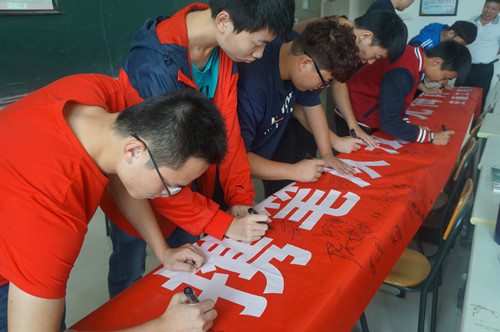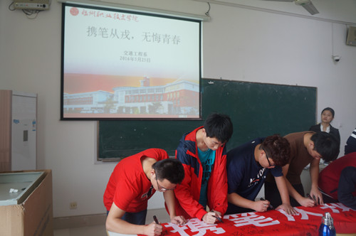发布者:交通工程系 发布时间:2016-05-27 浏览次数:470 “携笔从戎,无悔青春”签字仪式 2016年5月25日上午,交通工程系在一号楼504举办了“携笔从戎,无悔青春”的签字活动,主持人是辅导员蒋璐琳。13级汽车运用技术专业学生参加了本次活动。 经过了系部前期的征兵宣传,13级同学们对应征入伍,成为一名光荣的军人有了更加浓厚的兴趣。在听完辅导员对征兵政策的解读后,同学们纷纷在横幅在签下来了自己的名字,表达了自己参兵的意愿。现场反应热烈,气氛活跃,活动圆满成功!