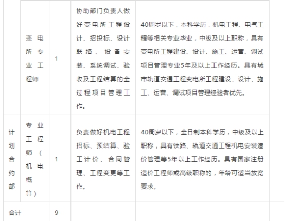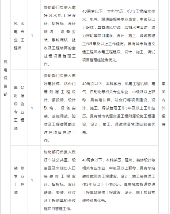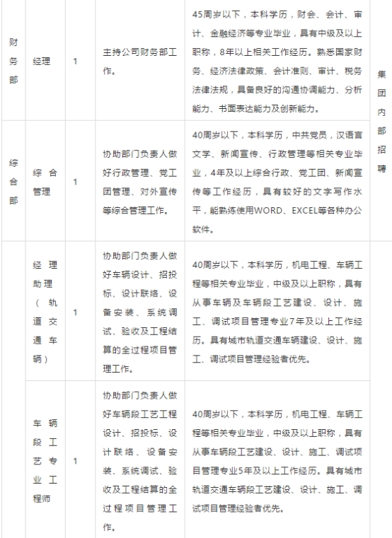 发布者:蒋璐琳 发布时间:2017-12-30 浏览次数:929 浙江杭海城际铁路有限公司招聘公告 一、基本情况。 浙江杭海城际铁路有限公司是省交通集团旗下新成立的一家控股子公司,主要负责全省首个PPP示范项目——杭海城际铁路工程的建设管理。该项目线路两端地处杭州、海宁,西起余杭高铁站(与已运营的杭州地铁1号线换乘),终点站碧云站,共12个站,线路全长48km,工程总投资136亿元。先行段于2016年底开工,2017年全线开工,建设期四年,计划于2021年底建成通车。 二、招聘岗位。 现因项目建设需要,面向集团内外部诚招人才共计9人,工作地点在浙江海宁。 三、报名时间:2017年12月18日至2018年1月3日 四、报名方式 符合岗位招聘条件者,请将岗位申请表(点击文末“阅读原文”进行下载)、学历、学位证书、职称证书、荣誉证书等电子材料发送至以下邮箱:hhtieluhr@163.com,联系人:李先生:0573-80772900.