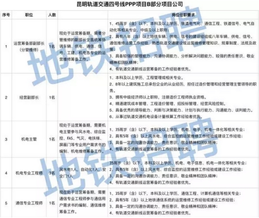 发布者:蒋璐琳 发布时间:2018-01-30 浏览次数:606 昆明轨道交通四号线PPP项目公司招聘昆明轨道交通地铁4号线PPP项目B部分投资由昆明轨道集团联合北京城建设计发展集团与中铁电气化局集团共同组成项目公司实施。昆明市轨道交通4号线PPP项目总建设期不超过5年,项目建成后,自试运营始计,B部分特许经营期为30年。 昆明市轨道交通4号线PPP项目B部分作为昆明市首批PPP项目,财政部公示的第二批PPP项目之一,具有独特的探索性和领先性,是连接主城与呈贡的西北、东南方向辅助线,串联了主城西北的国家高新技术产业开发区、主城中心区、主城东南的国家经济技术开发区,并向南连接呈贡新城,与1、2号线首期的交融互补,将是现代城市生活的再升级、是城市半径的无限延伸、是引导城市南北发展的又一核心轴带、是沿线各片区驶入城市化发展快车道的强劲动力。 线路起于陈家营站,止于昆明火车南站,线路沿金川路、海屯路、学府路、米轨走廊、彩云北路、贵昆路、官渡17号路(规划)、昆洛路、鲜花大道、古滇路、联大街、火车站大街布设,线路全长43.396km,均为地下线,设地下车站29座。规划将形成较为密集的客流走廊,设计运载人数全网最多、换乘线路最多、线网规模最大。 根据工作需要,昆明轨道交通地铁4号线PPP项目B部分面向社会公开招聘,具体招聘岗位如下: 招聘岗位: