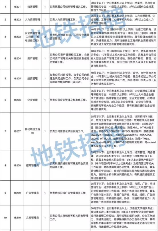 发布者:蒋璐琳 发布时间:2018-01-29 浏览次数:611 合肥地铁2018年社会招聘公告 根据合肥市轨道交通建设与管理需要,现面向社会公开招聘相关专业人员。有关事项公告如下: 一、招聘原则 公开、平等、竞争、择优。 二、招聘岗位及条件 (一)应聘人员须符合以下条件: 1.遵纪守法,品行端正,身体健康。 2.具有岗位所需的任职资格和相关条件。 3.在轨道交通建设及管理方面有丰富经验和突出业绩者,条件可适当放宽。 “年龄条件”中的“35周岁以下”为“1983年1月1日以后出生”(其他涉及年龄计算的依此类推)。 (二)有下列情形之一的人员,不得应聘: 1.不符合招聘岗位条件要求的人员; 2.全日制普通大中专院校在读学生; 3.曾因犯罪受过刑事处罚的人员和曾被开除公职的人员;受到党纪政纪处分期限未满或者正在接受纪律审查的人员;处于刑事处罚期间或者正在接受司法调查尚未做出结论的人员。 (三)具体岗位及要求详见(附件一)。