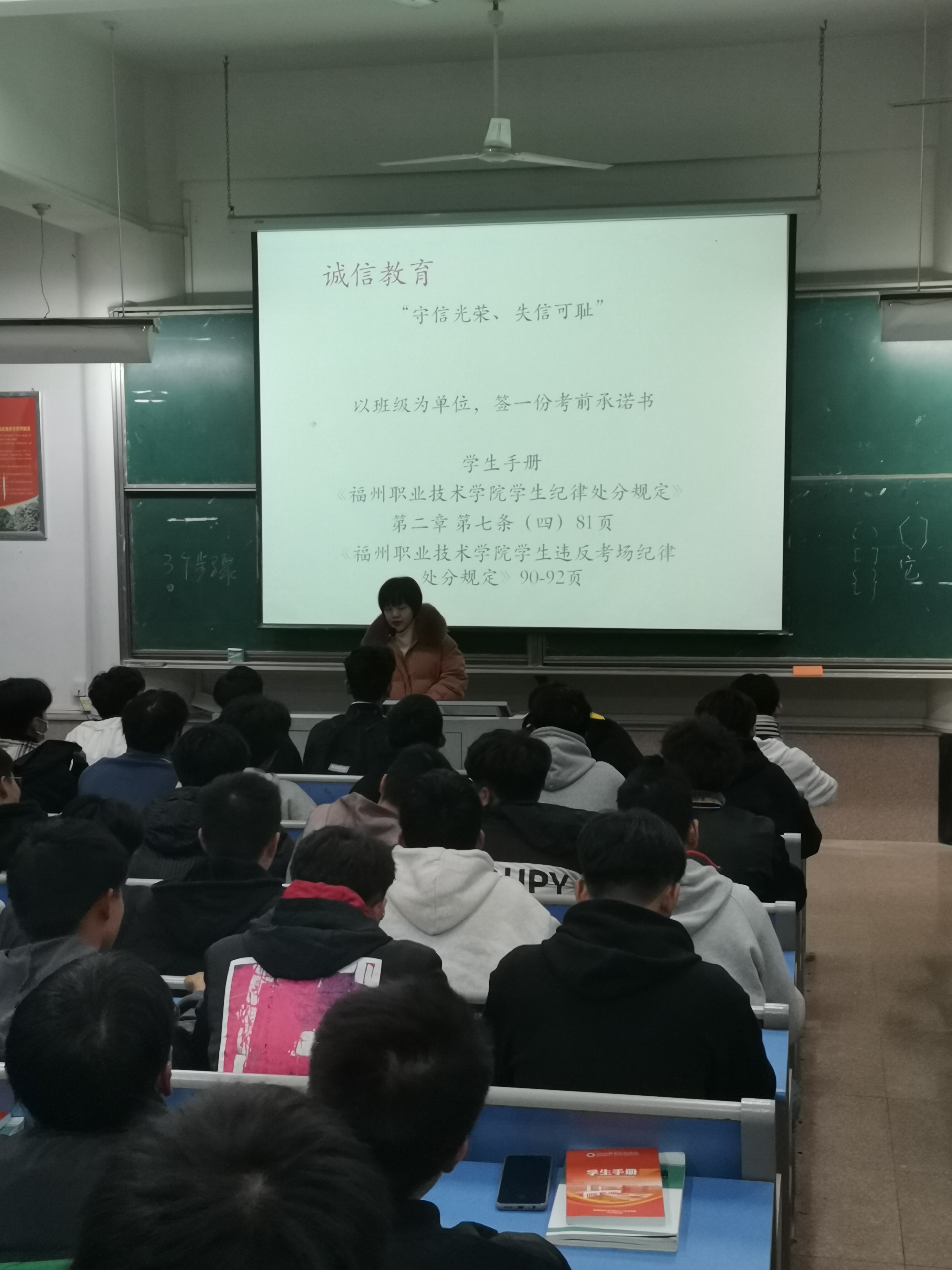 发布者: 发布时间:2020-12-25 浏览次数:295 交通工程学院2020-12-24 随期末考试的临近,为了营造良好的考试氛围、净化考场环境、杜绝有失诚信的舞弊行为。12月24日下午,交通工程学院在一号楼301教室为20级新生开展了“诚信考试”主题教育活动。 此次主题班会,谢薇辅导员深入浅出,旁征博引,为学生阐明了诚实守信、言行一致的重要性和必要性;以一个个鲜活的事例告诫学生,当今社会,如果失去诚信,将举步维艰,寸步难行。随后组织学生共同学习《学生手册》中关于学生违反考场纪律处分规定,强调学生遵守校规校纪的重要性。 会议结束后,各班班长组织班级同学在诚信考试承诺书签下自己的名字,以表达自己在即将来临的期末考试中“必将以实力证明自己”的决心。 通过此次主题活动,同学们深刻认识到了诚信应考的重要性,逐步树立了诚信应考的理念,相信在即将到来的期末考试中,同学们一定能够拿出积极饱满的态度,诚信应考,创造佳绩。 (图文/黄宏辉)