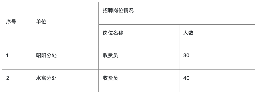 发布者: 发布时间:2022-03-05 浏览次数:503 70人!云南省交通投资建设集团有限公司昭通管理处招聘公告 为满足云南省交通投资建设集团有限公司昭通管理处生产经营需要,面向社会公开招聘生产人员和青年就业见习人员,招聘工作坚持公平、公开、公正原则,现将有关事项公告如下: 一、单位简介 云南省交通投资建设集团有限公司(以下简称“云南交投”),是云南省省属国有企业,是云南综合交通体系建设主力军、云南综合交通投融资主平台、云南综合交通全产业链经营实体。云南交投下设25个二级单位,现有职工1.8万余人,资产总额超过6283亿元,企业主体信用等级为AAA级,运营管养高速公路5300余公里。 昭通管理处是云南交投集团下设的二级单位,负责昭会高速公路(昭通段)、麻昭高速公路和水麻高速公路的车辆通行费征收、道路养护及运营管理工作;按照昭通市高速公路投资发展有限责任公司与云南省交通投资建设有限公司签订的委托运营管理合同书,负责串(盐津串丝)新(四川新市镇)高速公路的委托运营管理。 昭通管理处所辖水麻高速公路沿线7个收费站:水富收费站、楼坝收费站、庙口收费站、普洱渡收费站、中和收费站、豆沙关收费站、岔河收费站;2个隧管站:凉风凹隧管站、竹麻林隧管站。昭会高速公路(昭通段)沿线4个收费站:鲁甸收费站、田坝收费站、江底北收费站、江底南收费站;1个隧管站:大口子隧管站。麻昭高速公路沿线7个收费站:大关收费站、悦乐收费站、上高桥收费站、靖安收费站、昭通北收费站、昭通收费站、昭通南收费站;2个隧管站:凉水井隧管站、上高桥隧管站。委托运营管理的串新高速公路目前设有4个收费站:串丝收费站、板栗收费站、绥江收费站、南岸收费站;1个隧管站:板栗隧管站。 二、招聘岗位及计划 (一)招聘岗位及人数:收费员岗位70人,具体如下: (二)原则上收费员岗位优先招聘青年就业见习人员。见习人员在见习岗位见习3个月后,考核合格者可录用为生产人员。 (三)本次招聘人员工作地点为昭通管理处所属两个分处管辖路段沿线收费站。 (四)招聘岗位介绍 收费员(含内保员、监控员、隧管员含消防员、消防车驾驶员、机电维护员)(含见习岗位):主要从事高速公路收费站过往车辆的发卡、收费等工作。 三、招聘资格条件及要求 (一)基本条件 1.具有良好的品行和思想政治素质。 2.具有较强的工作责任心和业务能力。 3.具有正常履职的身体条件和心理素质。 4.具有满足招聘岗位所需要的专属条件。 5.具备一定的语言表达能力,有计算机操作和普通话基础。 6.男性身高165cm(含)以上,女性身高155cm(含)以上。 7.消防车驾驶员须持有B2及以上机动车驾驶证。 8.无吸毒史、无行处罚记录(如酒驾、赌博、涉黄)、无违法犯罪记录、无严重不良信用记录和其他不良嗜好。 (二)专属条件 1.见习人员资格条件:具有普通高校、中职院校毕业(含中等专科、职业高中、技工学校等)2年内未就业的毕业生,且年龄在18-24周岁的失业青年,其中:建档立卡贫困家庭、城乡低保家庭人员优先提供见习机会。 2.收费员、内保员、隧管员资格条件:具有高中、中专及以上学历,年龄在18-28周岁的人员(消防车驾驶员等特殊技能岗位人员可放宽至35岁)。 (三)有下列情形之一的人员,不得报名 1.因犯罪受过刑事处罚的或被开除公职的。 2.有违法、犯罪或违纪嫌疑,尚未查清的,立案审查尚未结案的。 3.受党纪处分、政务处分、组织处理未满规定时限或处分尚未解除的。 4.与云南交投集团及所属各单位签订劳动合同,且尚在劳动合同期内的。 5.与管理处现职员工之间有夫妻关系、直系血亲关系、三代以内旁系血亲或者近姻亲关系的,不得报名应聘双方直接隶属于同一领导人员的岗位或者有直接上下级领导关系的岗位。 6.按云南省交通投资建设集团有限公司规定不得报名的情形。 四、招聘流程 (一)报名 1.报名时间:2022年2月15日至3月20日。 2.报名方式:生产人员和青年就业见习人员均采取网络报名。报名人员登录(http://112.112.16.146:8888/zp.html#/)选择岗位进行网上报名。 3.报名要求:除采取网络报名外,管理处不受理其他任何形式的报名。每位报名人员仅可申请或应聘1个岗位,并按要求上传有关附件。 (二)资格复审 应聘者提交本人身份证、学历(学位)证、《云南省青年就业见习报名表》、职称证、职业资格证、体检健康证明(县级以上医院出具)、中国人民银行出具的个人征信记录、个人及特定关系人经商办企情况说明、个人参加社会保险(养老保险、医疗保险)参保证明等相关材料原件,并出示个人健康码及通信行程卡,到昭通管理处水富分处、昭阳分处参加资格复审。资格复审时间另行通知。 水富分处地址:水富市高滩新区昭通管理处水富分处综合办公室,咨询电话:0870—8632605; 昭阳分处地址:昭通市昭阳区温泉泰和城延长线(昭通收费站旁)昭阳分处综合办公室,咨询电话:0870-2159730。 (三)笔试 资格复审合格者,凭身份证参加笔试。笔试按百分制进行评分,占综合成绩的40%。笔试时间地址另行通知。 (四)面试 笔试合格者可参加面试。面试主要对应聘者口头表达能力、普通话水平、工作态度、求职动机、仪表举止、综合分析能力等进行综合评判。面试按百分制进行评分,占综合成绩的60%,面试地点、面试时间另行通知。 (五)综合成绩计算方法 综合成绩=