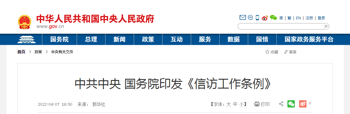 信访工作条例(2022年1月24日中共中央政治局会议审议批准 2022年2月25日中共中央、国务院发布)