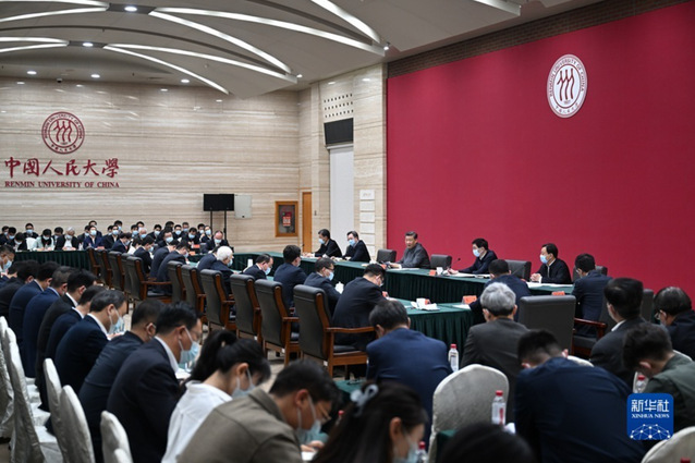 4月25日上午,中共中央总书记、国家主席、中央军委主席习近平来到中国人民大学考察调研。这是习近平同师生代表座谈并发表重要讲话。新华社记者 谢环驰 摄 随后,习近平来到世纪馆北大厅同中国人民大学师生代表座谈。中国人民大学党委书记张东刚、“人民教育家”国家荣誉称号获得者高铭暄、经济学院教授赵峰、新闻学院博士生周晓辉、哲学院本科生王海蓉先后发言,现场气氛轻松热烈。 4月25日上午,中共中央总书记、国家主席、中央军委主席习近平来到中国人民大学考察调研。这是习近平同师生代表座谈并发表重要讲话。新华社记者 鞠鹏 摄 在认真听取大家发言后,习近平发表重要讲话。他强调,我国有独特的历史、独特的文化、独特的国情,建设中国特色、世界一流大学不能跟在别人后面依样画葫芦,简单以国外大学作为标准和模式,而是要扎根中国大地,走出一条建设中国特色、世界一流大学的新路。中国人民大学从陕北公学成立之初就鲜明提出要培养“革命的先锋队”,到新中国成立之初提出培养“万千建国干部”,到改革开放新时期提出培养“国民表率、社会栋梁”,再到新时代提出培养“复兴栋梁、强国先锋”,始终不变的是“为党育人、为国育才”,展现了“党办的大学让党放心、人民的大学不负人民”的精神品格。希望中国人民大学落实立德树人根本任务,传承红色基因,让听党话、跟党走的信念成为人大师生的自觉追求。