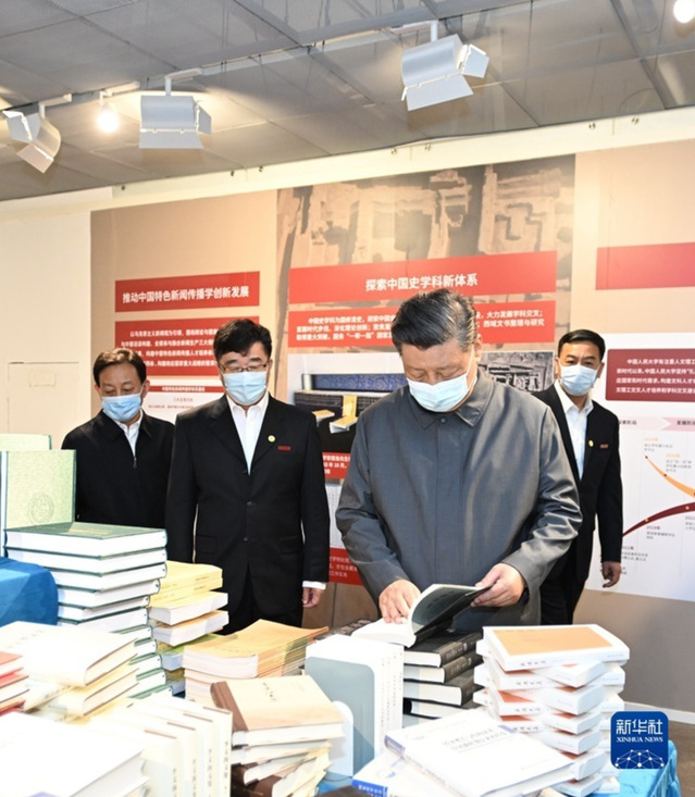 4月25日上午,中共中央总书记、国家主席、中央军委主席习近平来到中国人民大学考察调研。这是习近平在图书馆考察。新华社记者 燕雁 摄 中国人民大学图书馆以人文社会科学学术性文献馆藏为主,有藏书410余万册。习近平来到这里,考察馆藏红色文献、古籍集中展示,察看现代化检索平台和复印报刊资料等数字化学术资源,听取学校加强文献古籍保护利用,促进理论研究成果转化应用等情况介绍。习近平强调,人民大学馆藏红色文献,鉴证了我们党创办正规高等教育的艰辛历程,是十分宝贵的红色记忆,要精心保护好,逐步推进数字化,让更多的人受到教育、得到启迪。要运用现代科技手段加强古籍典藏的保护修复和综合利用,深入挖掘古籍蕴含的哲学思想、人文精神、价值理念、道德规范,推动中华优秀传统文化创造性转化、创新性发展。要加强学术资源库建设,更好发挥学术文献信息传播、搜集、整合、编辑、拓展、共享功能,打造中国特色、世界一流的学术资源信息平台,提升国家文化软实力。