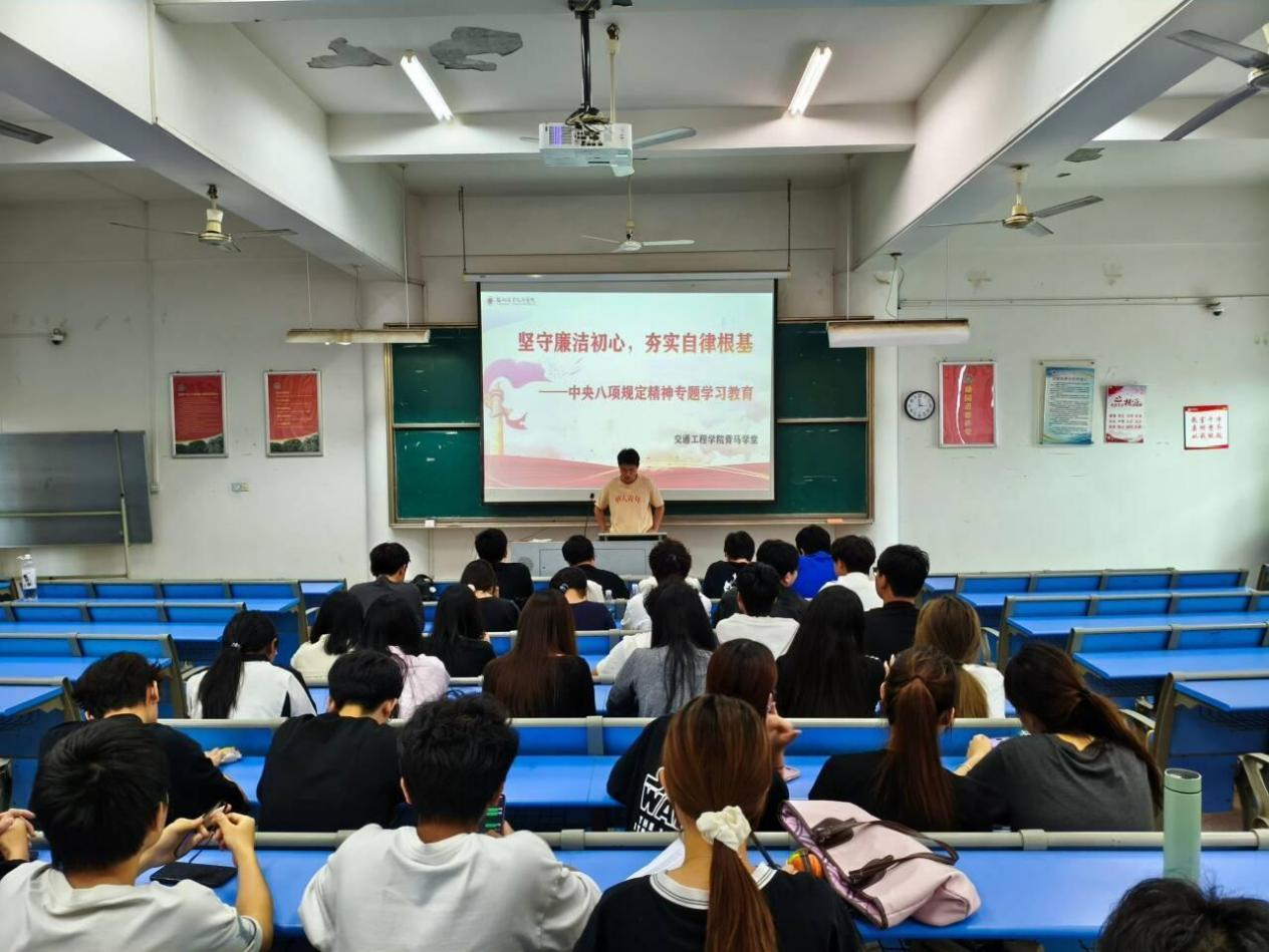 为深入贯彻中央八项规定精神学习教育,切实加强青年政治骨干的思想淬炼与纪律意识,交通工程学院于4月23日下午在一号楼401组织青马班学员开展中央八项规定精神专题学习活动。此次活动旨在深化青马班学员廉洁自律意识,引导青年骨干坚定理想信念、严守纪律规矩,以实际行动响应全党深入贯彻中央八项规定精神的具体要求。