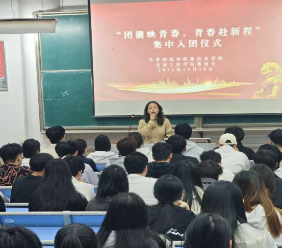 发布者:交通工程学院 发布时间:2025-12-10 浏览次数:10 2025年12月10日,交通工程学院隆重举行新团员集中入团和老团员重温入团仪式活动,活动由团总支书记高凌飞主持,新发展团员及部分老团员代表参加。 仪式在庄严的《中国共产主义青年团团歌》中拉开帷幕。高凌飞老师首先宣读了新团员名单,随后学院团总支书记和老团员代表为新团员佩戴团徽、颁发团员证,象征着新成员正式加入共青团大家庭。在领誓人的带领下,新团员面向团旗庄严宣誓,铮铮誓言展现出青年学子坚定的理想信念与责任担当。最后,高凌飞老师勉励新团员,要以入团为新起点,深入学习党的创新理论,将个人理想融入交通强国建设与中国式现代化进程,在学业钻研与实践服务中锤炼本领,以实际行动践行“请党放心,强国有我”的青春誓言。新团员纷纷表示,将以团员身份严格要求自己,努力成长为有理想、敢担当、能吃苦、肯奋斗的新时代好青年,为学校发展与国家建设贡献青春力量。