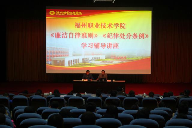 为深入贯彻学习《中国共产党廉洁自律准则》和《中国共产党纪律处分条例》,2015年12月23日下午,院纪委邀请市委党校党建教研部副主任兰荣禄副教授到我院做了题为《全面从严治党的“高线”与“底线”》的专题学习辅导讲座。讲座由纪委庄晓钟书记主持,院领导、副科级及以上领导干部、全体师生党员、党风廉政及效能监督员、学院党校第26期党基班入党积极分子等参加报告会。