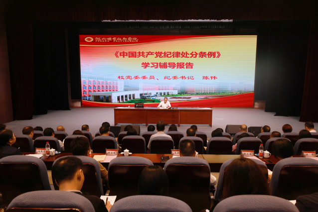 开班动员讲话后,校党委委员、纪委书记陈伟作《中国共产党纪律处分条例》学习辅导报告。他从正确认识学习《条例》的重大意义、准确把握《条例》修订的主旨要义、《条例》修订的突出特点以及部分条文的学习等四个方面,对《条例》做了全面解读和具体讲解,报告主题鲜明、内容丰富,既有理论概括,又援引典型案例,为与会党员干部上了一堂生动精彩、发人深省的党纪学习教育专题辅导课。