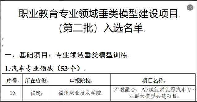 近日,教育部公布了第二批职业教育专业领域垂类模型建设项目入选名单,福州职业技术学院交通工程学院申报的“产教融合,AI赋能新能源汽车专业群大模型共建项目”成功入选汽车专业领域基础项目。