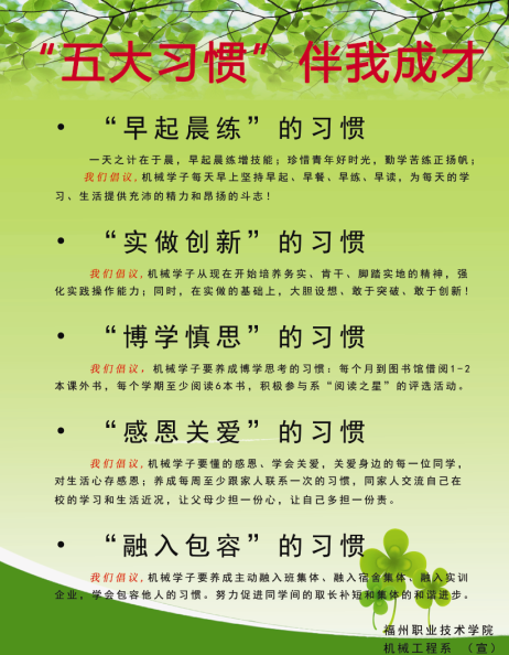 机械工程系为了更好的培养学生养成良好行为习惯,提高道德修养,从2013年上半年在全系学生中推行开展“五大习惯伴我成才”活动,活动开展一学期以来,学生精神面貌和文明礼仪有很大的改善,为此,机械工程系特别针对2013级新生开展此项活动,希望在新生入学之初,让他们铭记和践行早起晨练的习惯、实做创新的习惯、博学慎思的习惯、感恩关爱的习惯、融入包容的习惯。