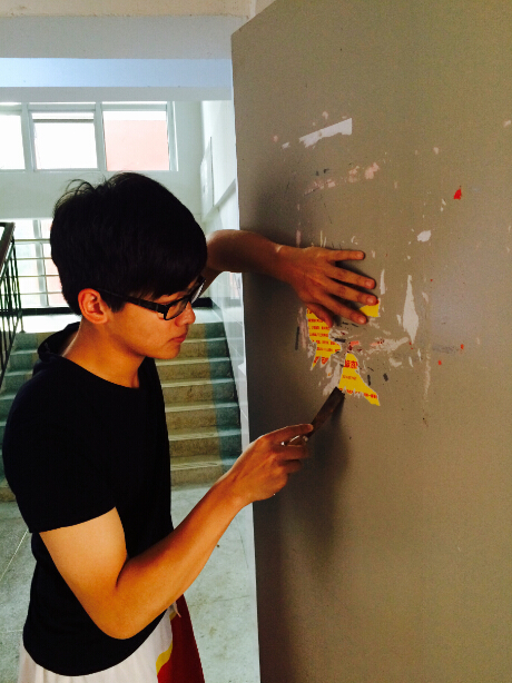 在“五四”青年节期间,机械工程系组织青年学生和团员干部在11#学生公寓楼开展了“美化校园、文明共享”的校园牛皮癣专项整治活动,为校园美化奉献自己的一份力量。在本次活动中,青年学生有的拎着涂料、铲子,有的手拿钢刷、小钢刀、钢丝球,有的则提着扫把、畚斗,大家相互配合,相互帮助,干劲十足,对墙面上的每一块“牛皮癣”进行认真清理。经过大家的辛勤劳动,共清理公寓楼层内各类广告100多张,恢复了公寓墙面的清洁。同时,广大青年学生还深入宿舍,宣传文明校园和五四青年节相关知识,倡导每个学生都承担一份责任,为国家、校园的建设添砖加瓦。