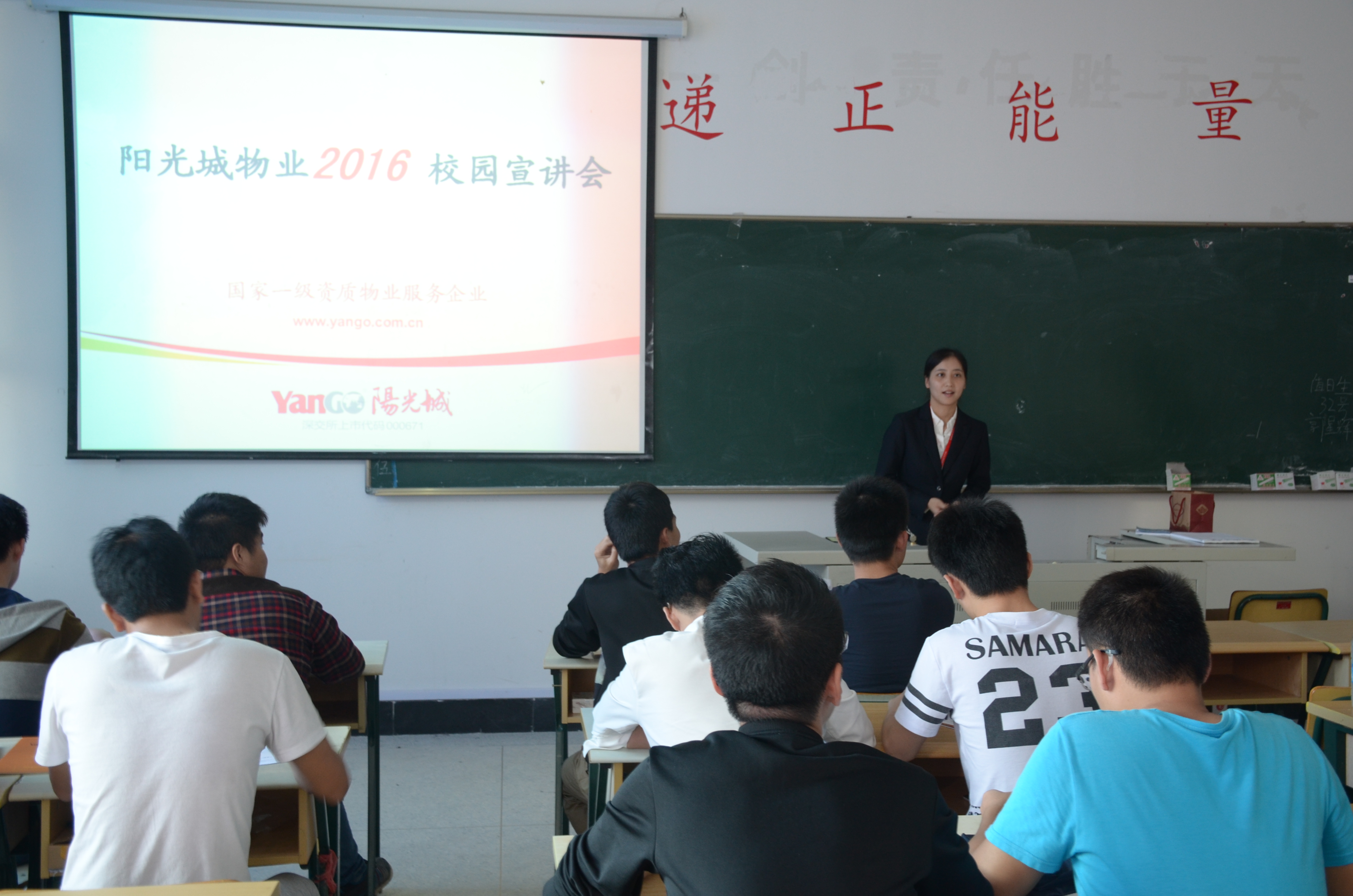 2015年11月16日,福建阳光城物业服务有限公司针对机械工程系2016届全体毕业生在实训楼408教室召开专场招聘会,该公司是阳光城集团的全资子公司,成立于2001年7月,是一家具有独立法人资格的一级资质的专业物业服务企业,现为中国物业管理协会会员单位、福建省及福州市物业管理协会常务理事单位。