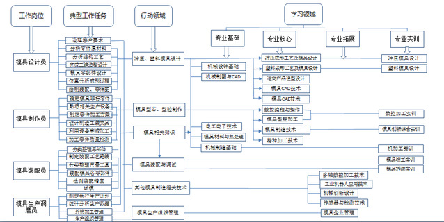 模具生产组织管理 | 组织企业生产 | 根据企业车间生产管理规定、生产车间各部门生产特点合理组织生产,满足企业订单生产要求;协调生产车间各部门的生产, | 企业生产管理能力,服务能力,沟通表达能力。 |