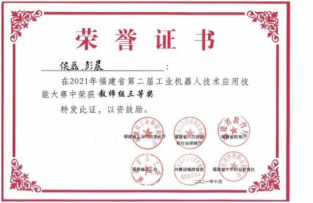 在2021年10月28日举行的“2021年福建省第二届工业机器人技术应用技能大赛暨全国工业机器人技术应用大赛”中,机电工程学院青年教师彭晨、侯磊,凭借扎实的专业知识、操作技能和默契的配合,在强手如林的赛场沉着努力、勇于创新。经过激烈角逐,最后荣获教师组竞赛第三名的好成绩。