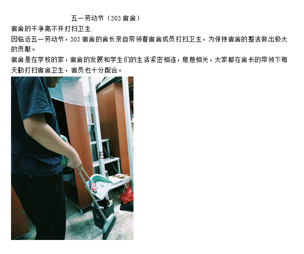 为进一步弘扬劳动精神,教育引导学生崇尚劳动、尊重劳动,懂得劳动最光荣、劳动最崇高、劳动最伟大、劳动最美丽的道理,在“五一”国际劳动节来临之际,机电工程系于2022年4月25日至4月28日开展了五一宿舍劳动文化活动,各宿舍积极组织宿舍成员打扫卫生,展示劳动技能,贡献宿舍防疫小方法等,让机电工程系所有宿舍积极参与到五一劳动文化活动当中,同学们通过劳动,改善了宿舍环境,锻炼了身体,进一步学习了防疫知识。