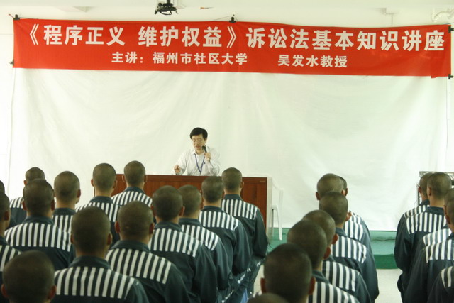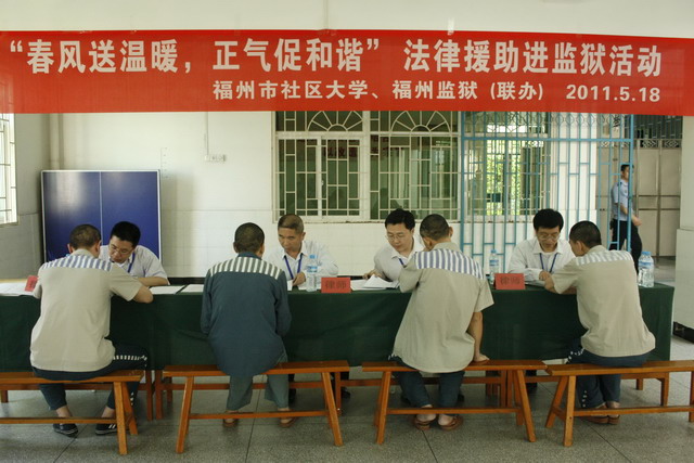 5月18日下午,福州市社区大学与福州监狱联合启动“春风送温暖,正气促和谐”系列法律活动,本次活动将突出“普法、维权、促改造”为主题,全面拉开法律讲座及法律援助进监狱系列活动的帷幕。 吴发水副教授首先作了《程序正义,维护权益――刑事诉讼法基本知识》专题讲座;讲座结束,由我校教师吴发水、张章盛、林海榕、谢剑辉等4人组成的律师团队现场开展法律援助活动。 律师团队广泛宣传了《法律援助条例》,热情接受服刑人员的法律咨询及援助服务。服刑人员中有因入监导致婚变面临离婚子女抚养问题、有因家庭财产变更遇到归属权问题、有因对裁决不服需要提出申诉的法律程序问题、有对减刑假释政策的理解问题、有对新时期社区矫正政策的咨询等。通过我校律师团队不厌其烦、一丝不苟、反复耐心的解惑释疑、梳理引导,很多服刑人员从中受到了一次实实在在的普法教育,增长了法律知识,解除了心中困扰,卸下了思想包袱。当天共有300多名服刑人员得到了法律服务人员的专业解答。大家在为自己的困惑得到解决而欣喜的同时,更由衷感激我校律师团队的敬业奉献精神,感激福州监狱给予服刑人员享受法律援助。此外,我校律师团队对确有可能存在刑罚偏重或刑期折抵问题的服刑人员,将进行个别调查研究,争取给予进一步的法律援助。