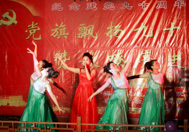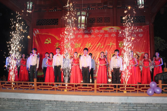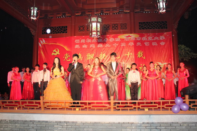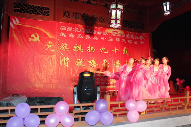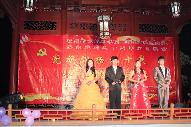 为庆祝中国共产党成立90周年,响应市委、市政府创建全国文明城市的号召,丰富社区群众精神文化生活,6月2日晚,由福州职业技术学院、福州市社区大学主办,福州职业技术学院应用外语系、台江区茶亭街道文化站、福德社区联合承办的庆祝建党九十周年“党旗飘扬九十载,赞歌嘹亮进社区”文艺晚会在台江区茶亭公园内隆重举行。
