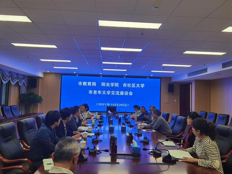 张兰英副校长介绍福州市社区大学终身教育工作开展情况、翁云锋处长介绍福州市终身教育工作现状,乔海曙校长介绍来校调研目的,三方就社区(老年)教育体系建设、终身教育工作经验、提升共建层次、合作办学、创建社区教育学习品牌等相关问题进行了深入交流。